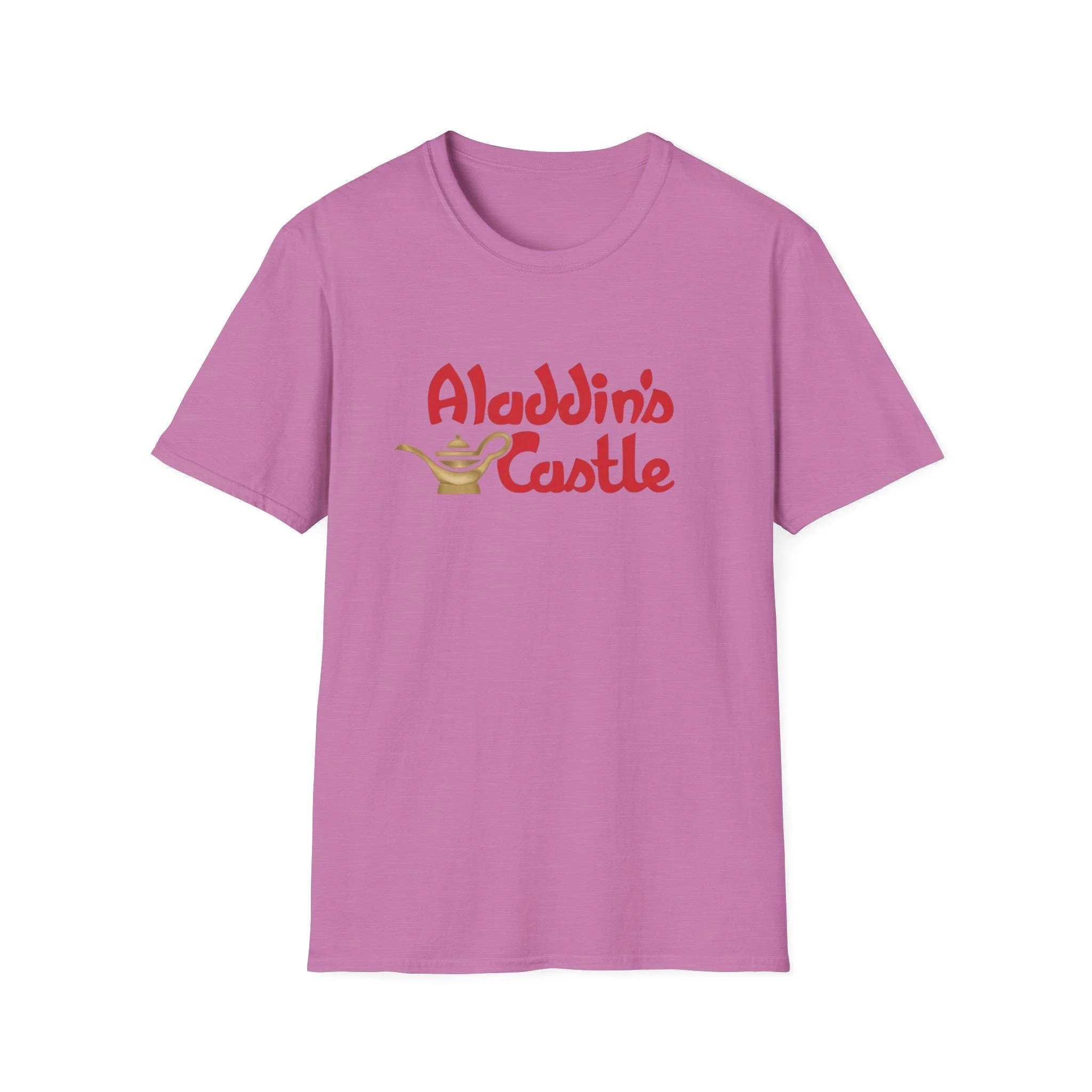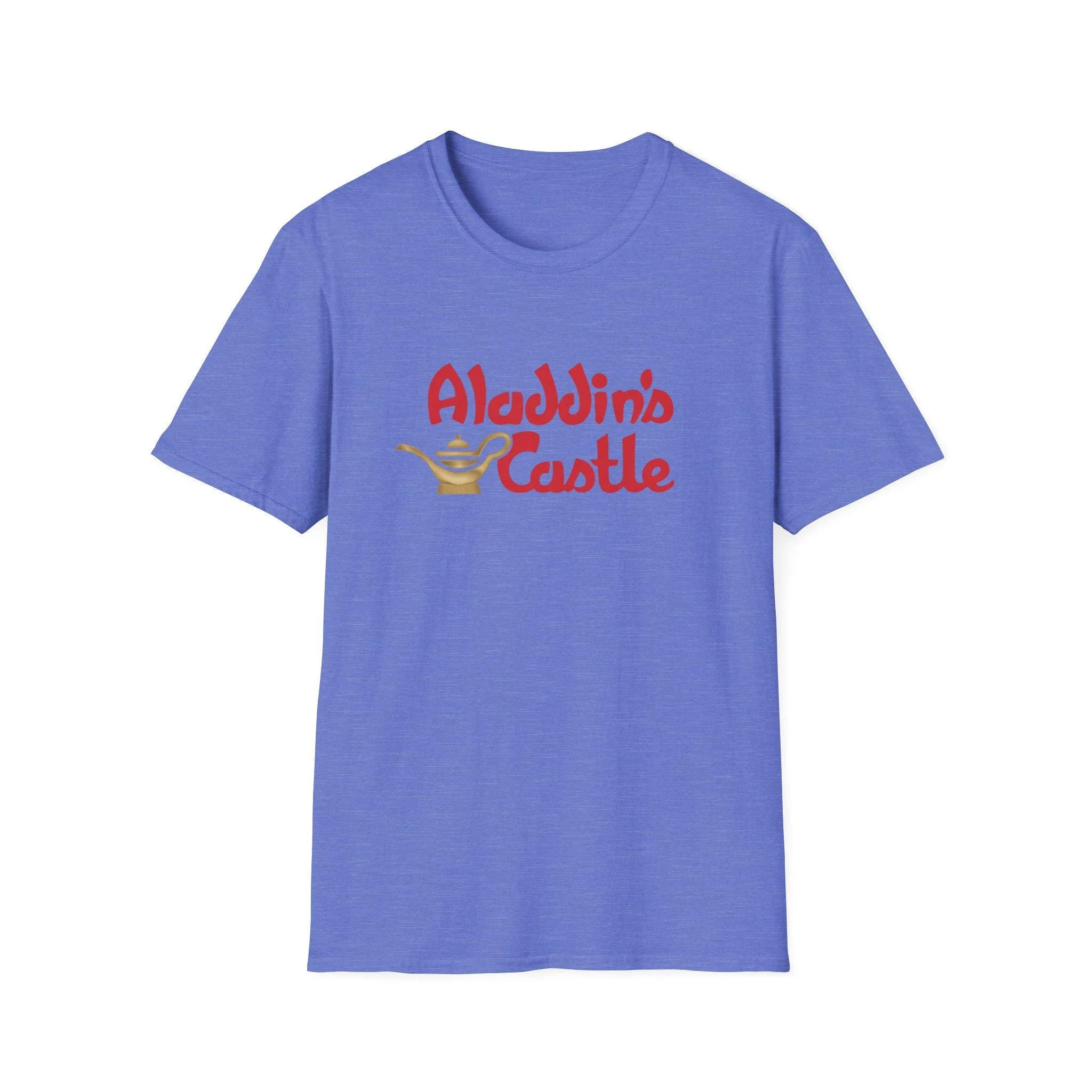 Soft, light, and quietly nostalgic — this tee carries a simple, whimsical “Aladdin’s Castle” design with a tiny golden lamp for a wink of arcade magic. The shirt drapes easily, breathes in warm weather, and layers cleanly under jackets or over long sleeves. Wear it to a weekend market, a low-key movie night, or while wandering a flea market; the design feels like a private nod to anyone who loves retro fantasy and gentle humor. The lettering’s vintage-curvy style and the petite lamp make the shirt feel handmade and personal, not loud — a cozy everyday piece that slips into your routine and sparks small smiles.