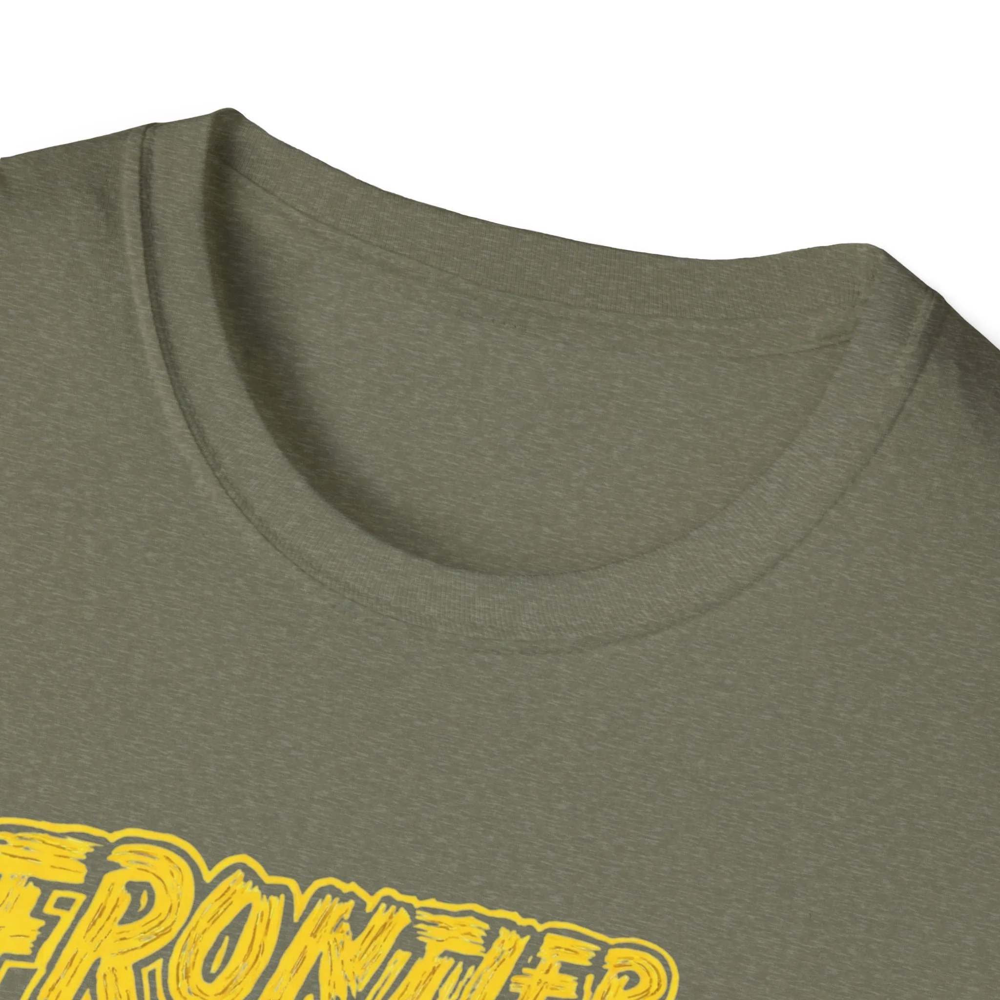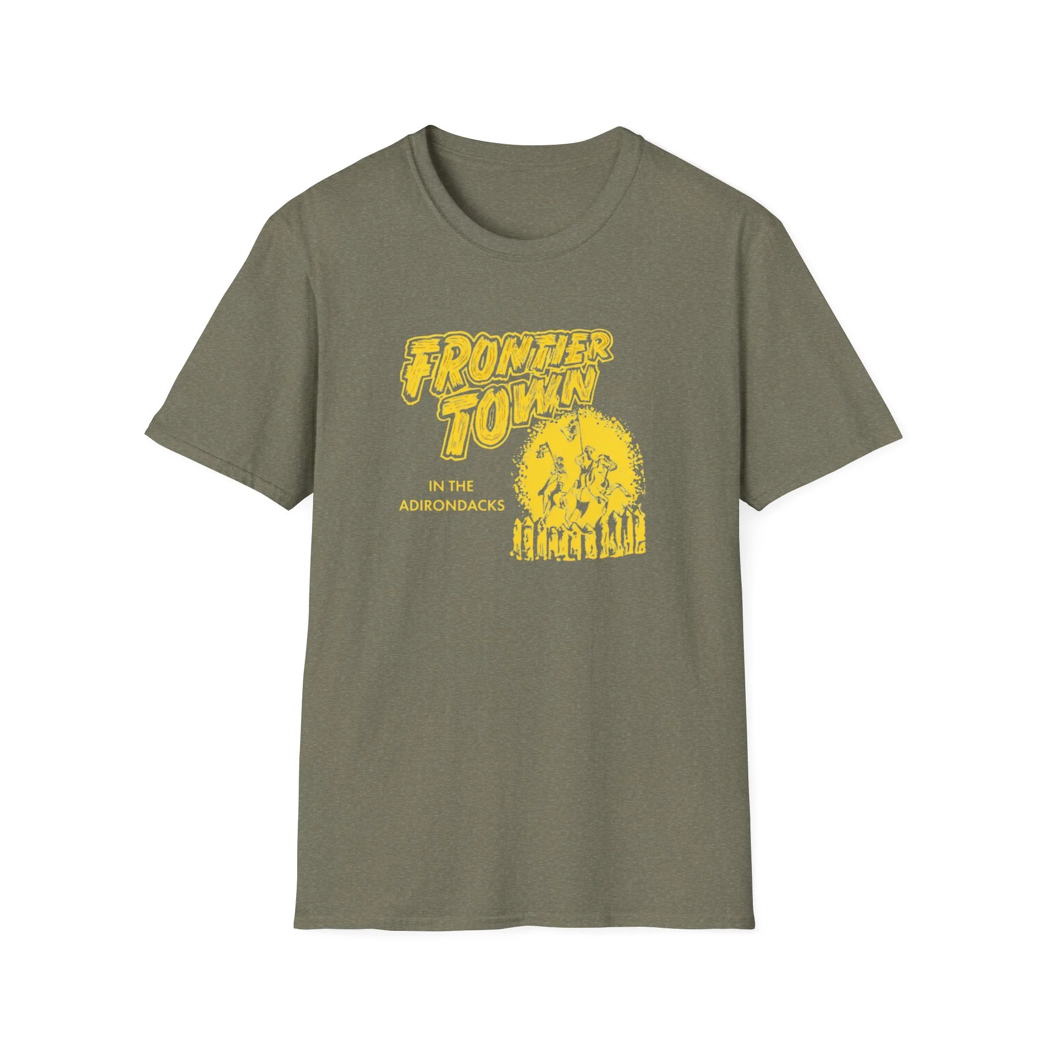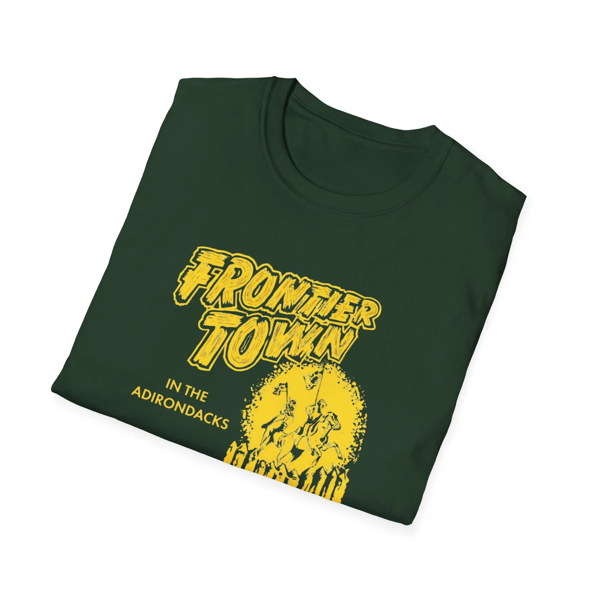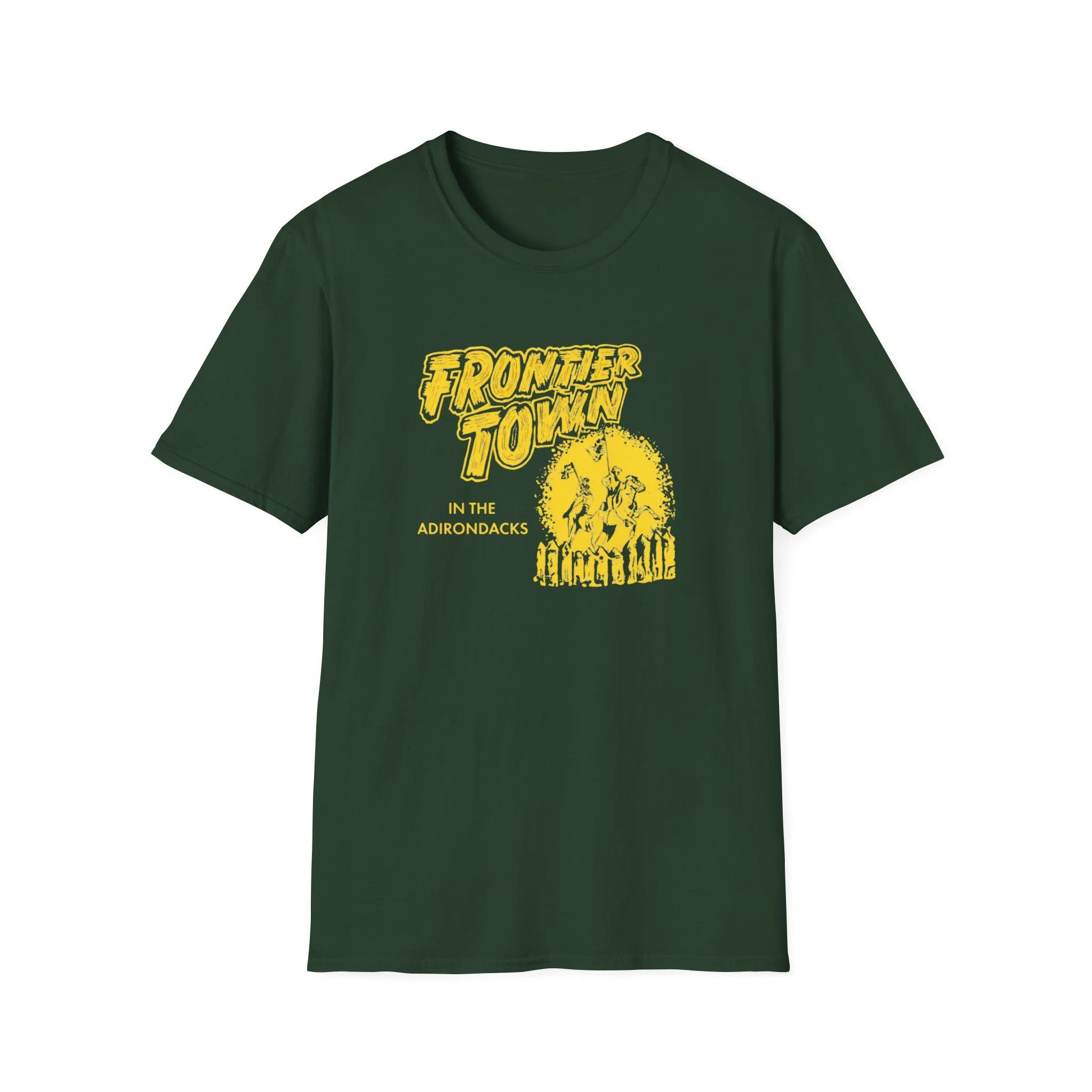 A soft, lived-in tee that carries the rustic energy of Adirondack trails and small-town summer nights. The vintage-inspired yellow print reads “Frontier Town” over a sunburst and a row of pine silhouettes — a design that feels like a weathered concert poster or a road-trip souvenir. Lightweight ring-spun cotton drapes easily, so this shirt becomes a go-to layer for morning coffee on the porch, late-afternoon hikes, or low-key gatherings at the lake. It pairs naturally with worn denim, muddy boots, or a flannel tied around the waist. The breathable fabric and classic crew cut keep you comfortable while the bold chest graphic quietly shows where your heart wanders.