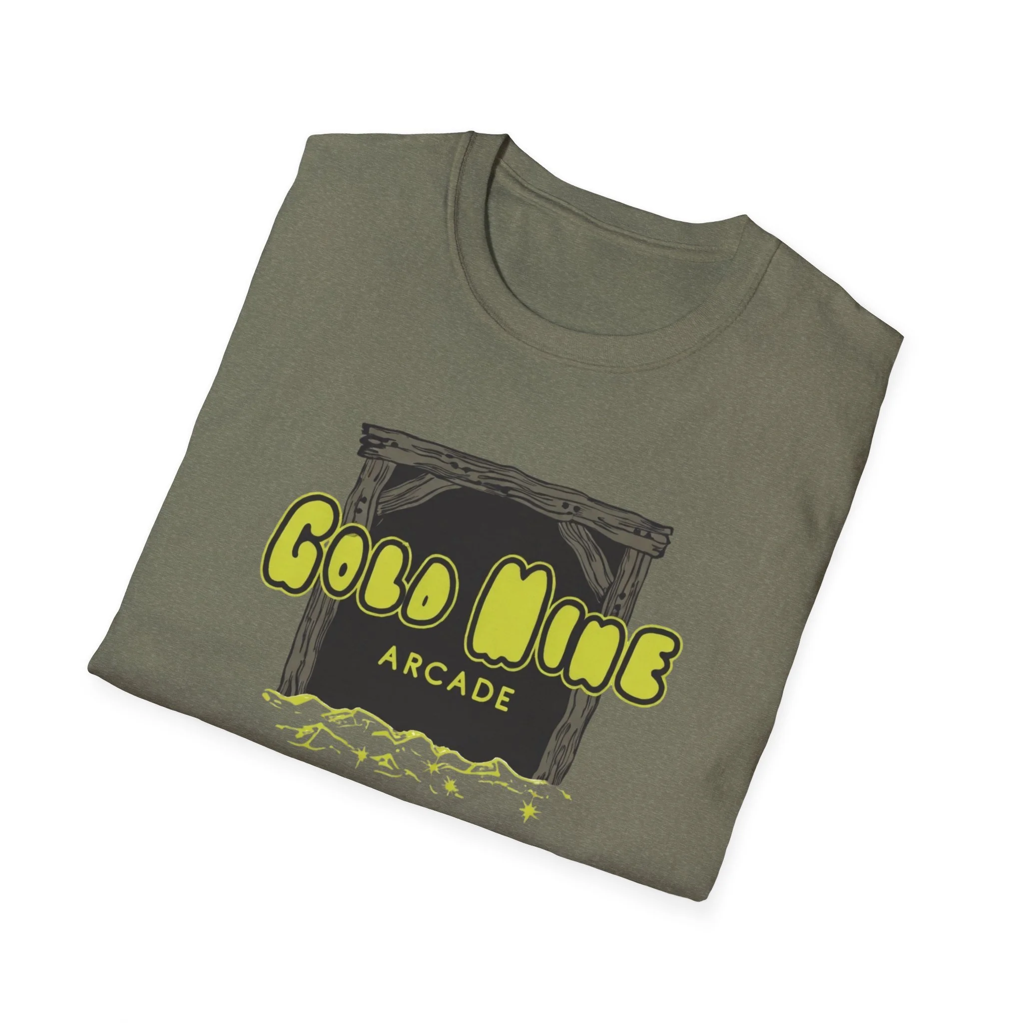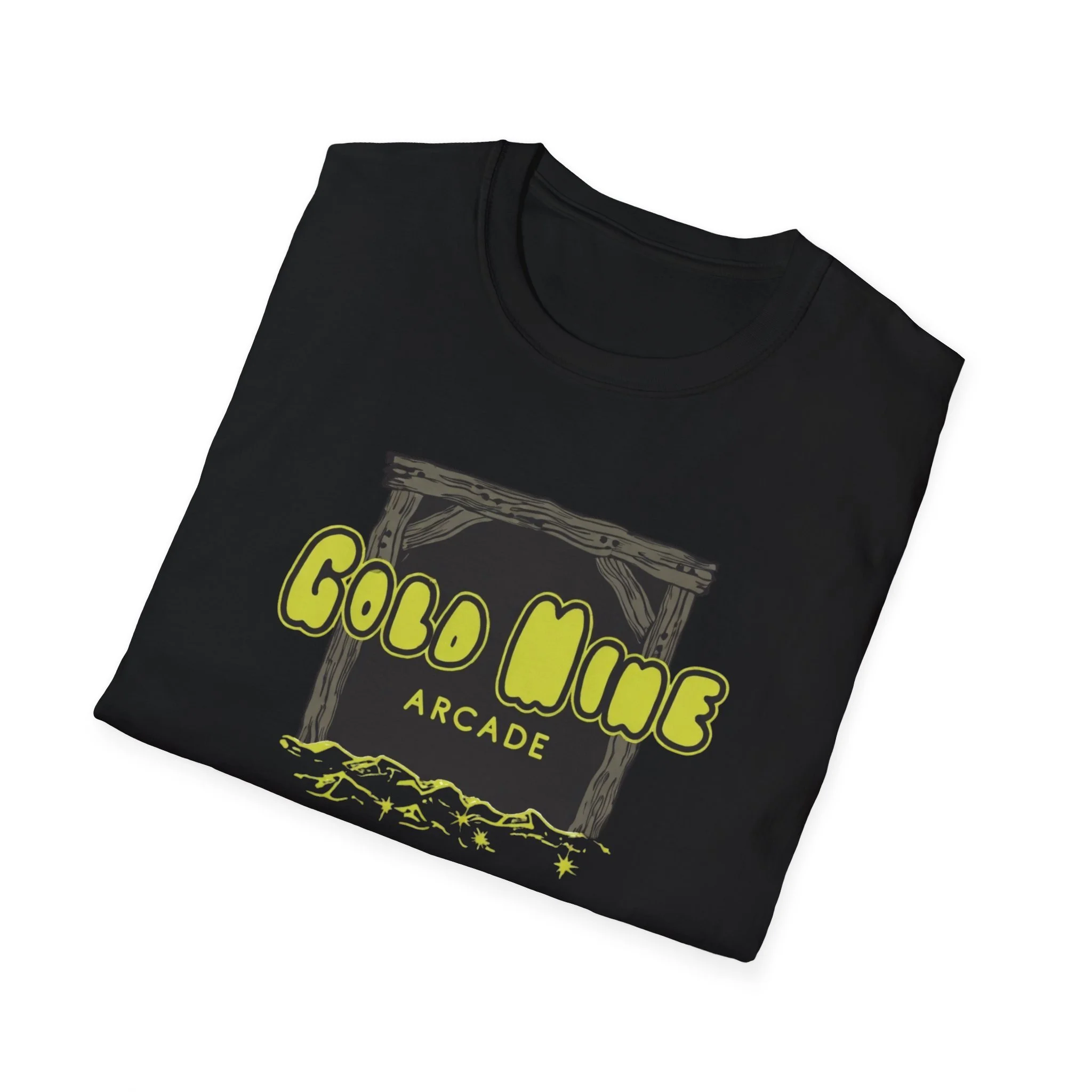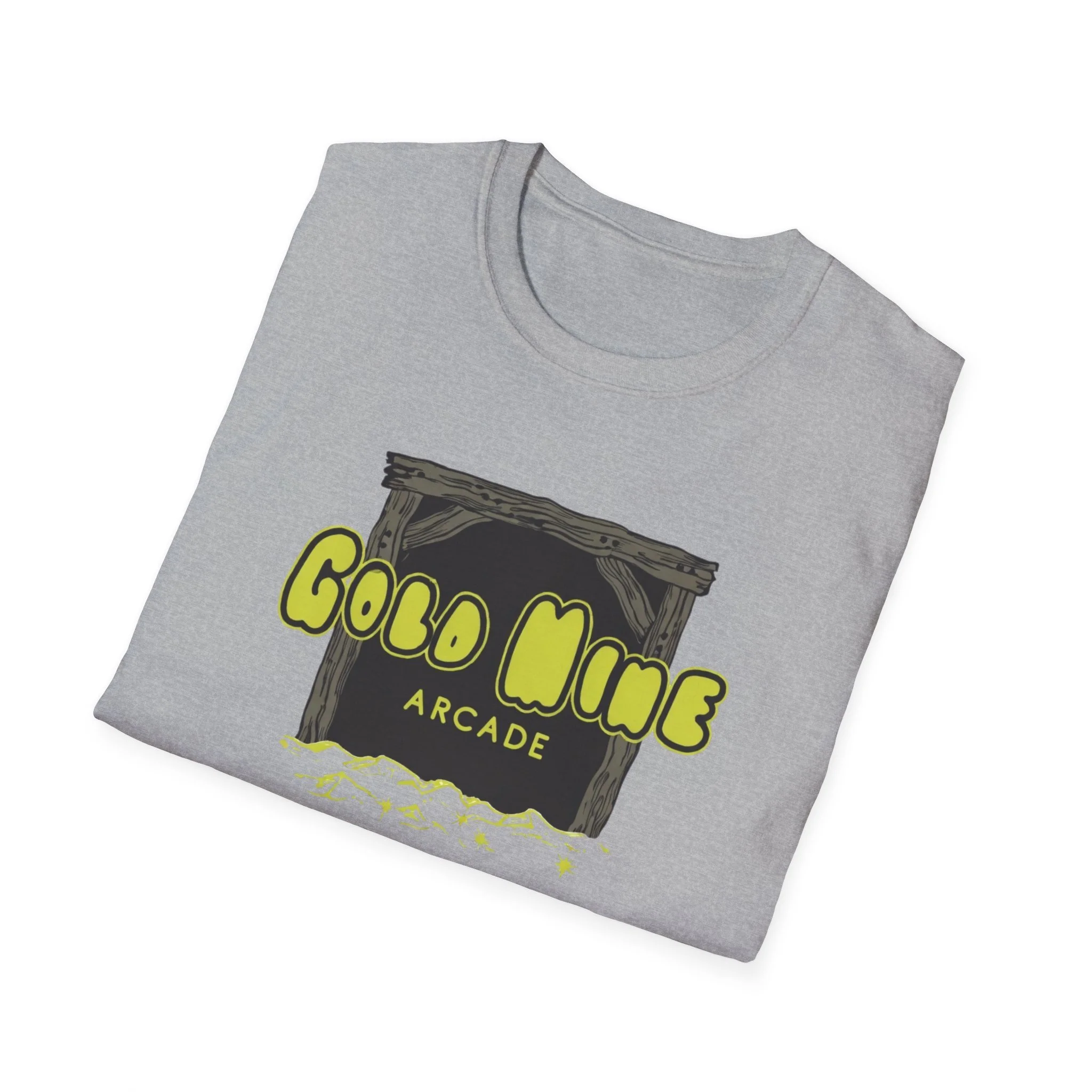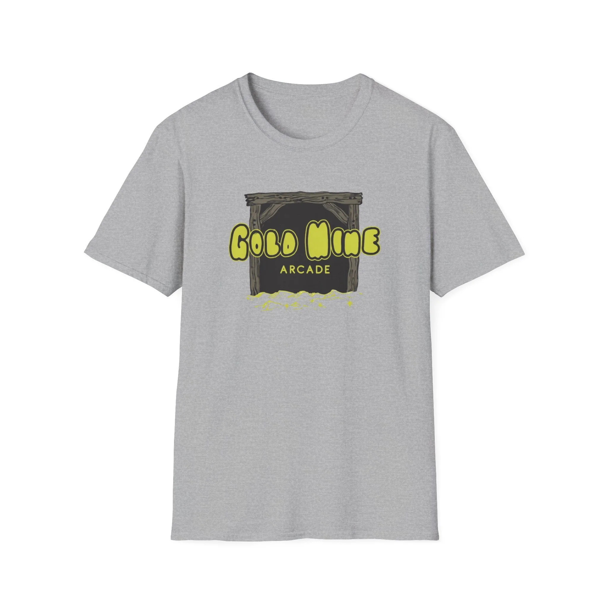 This lightweight cotton tee carries a subtle retro-arcade vibe—soft to the touch, breathable, and made to be lived in. The front graphic reads “Gold Mine Arcade” in bright, slightly weathered lettering above a sketch of a mine entrance and scattered nuggets, lending a nostalgic, game-room energy without shouting for attention. On black or darker colorways the neon-like yellow pops with contrast; on natural tones the fabric’s tiny flecks add a vintage character. It sits cleanly at the chest so you can layer it under a flannel or wear it solo at meetups, shows, or casual nights out. The low-profile crew neck and classic fit keep the silhouette relaxed but tidy—easy to move in, comfortable during long sets or weekend hangs.