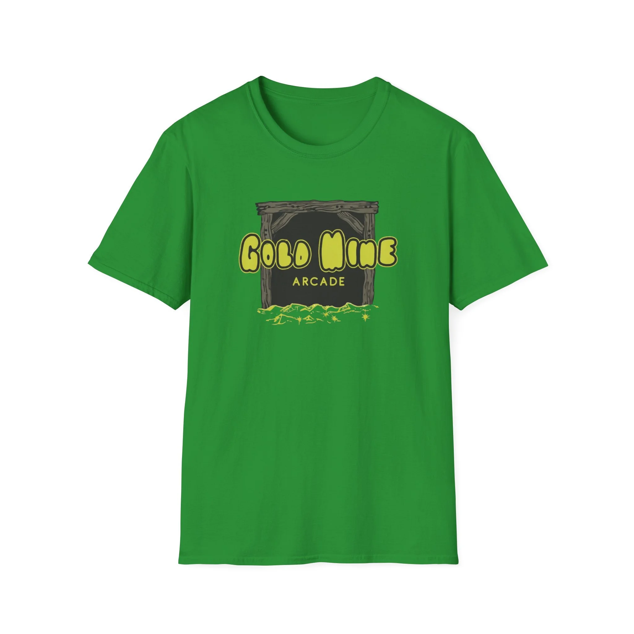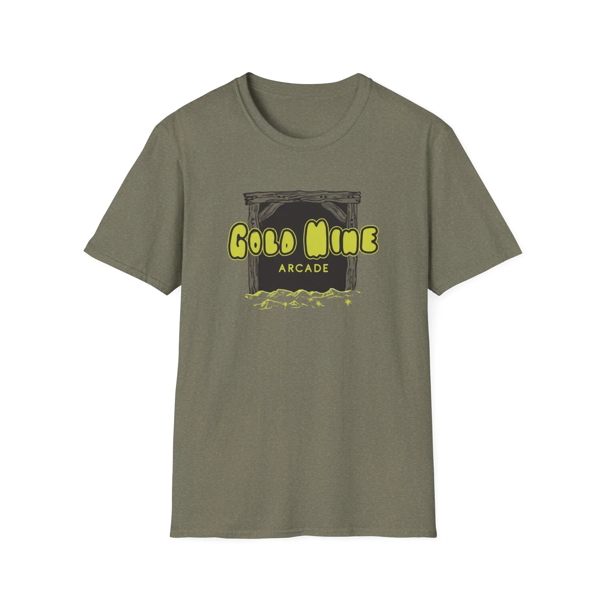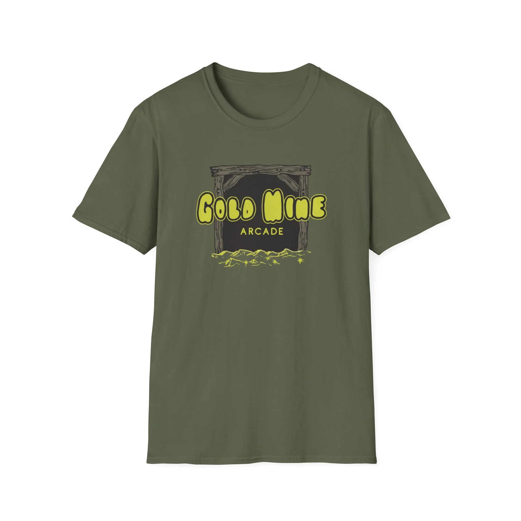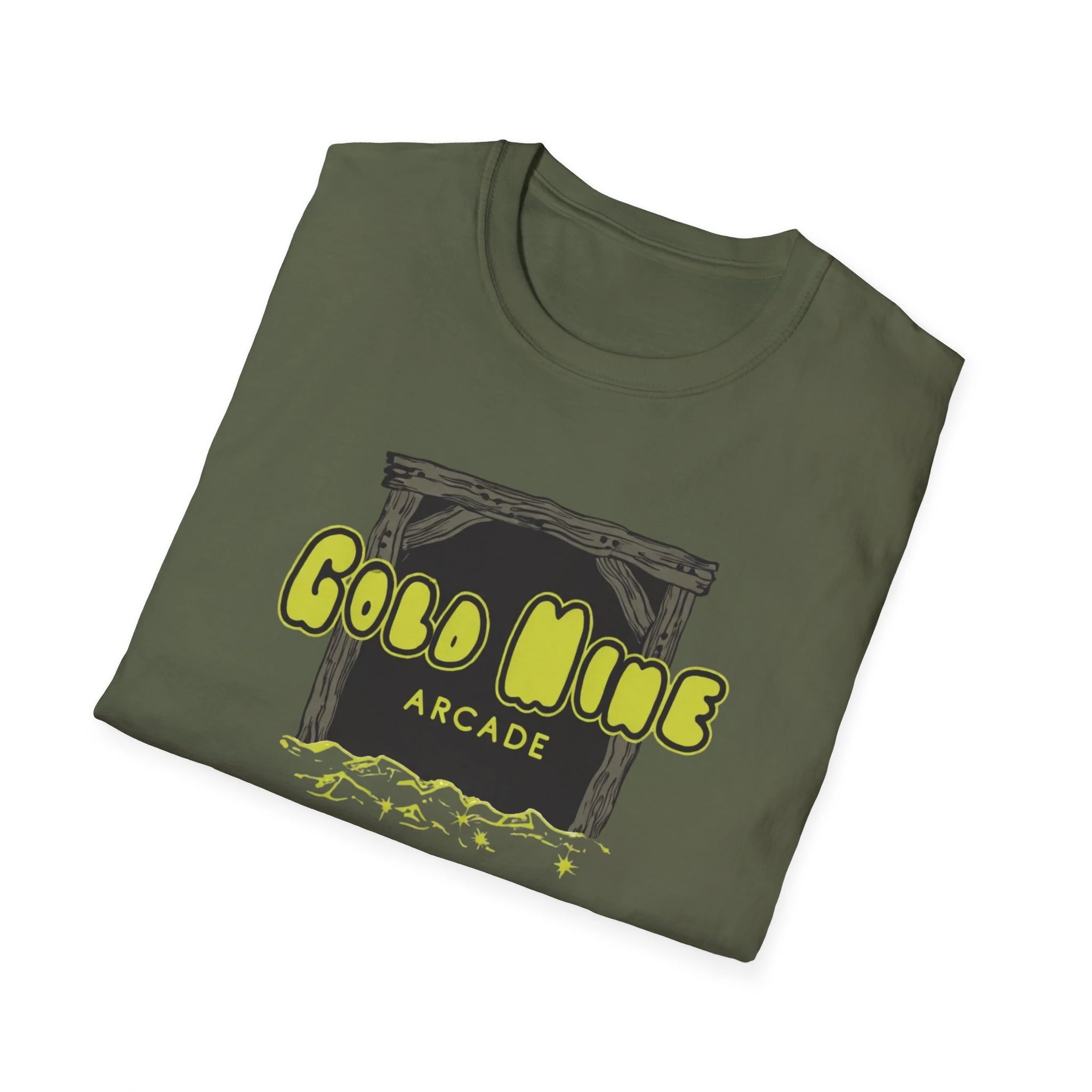 This lightweight cotton tee carries a subtle retro-arcade vibe—soft to the touch, breathable, and made to be lived in. The front graphic reads “Gold Mine Arcade” in bright, slightly weathered lettering above a sketch of a mine entrance and scattered nuggets, lending a nostalgic, game-room energy without shouting for attention. On black or darker colorways the neon-like yellow pops with contrast; on natural tones the fabric’s tiny flecks add a vintage character. It sits cleanly at the chest so you can layer it under a flannel or wear it solo at meetups, shows, or casual nights out. The low-profile crew neck and classic fit keep the silhouette relaxed but tidy—easy to move in, comfortable during long sets or weekend hangs.