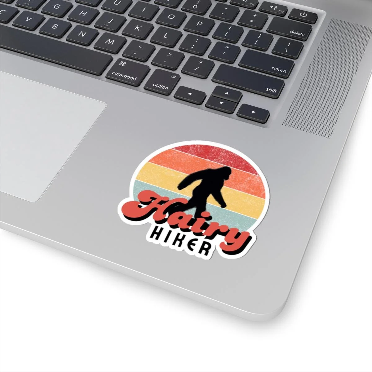 Celebrate outdoor mischief and tongue-in-cheek wilderness pride with this glossy kiss-cut sticker. A retro sunburst backdrop in warm, faded hues frames a bold Sasquatch silhouette and playful script that reads “Hairy Hiker.” The compact, durable vinyl holds bright eco-solvent inks for long-lasting color and a scratch-resistant shine. Stick it on a laptop, water-free journal, or window to add a wink of personality to your gear — it peels on smoothly and lays down bubble-free for a clean, vintage-ready look.