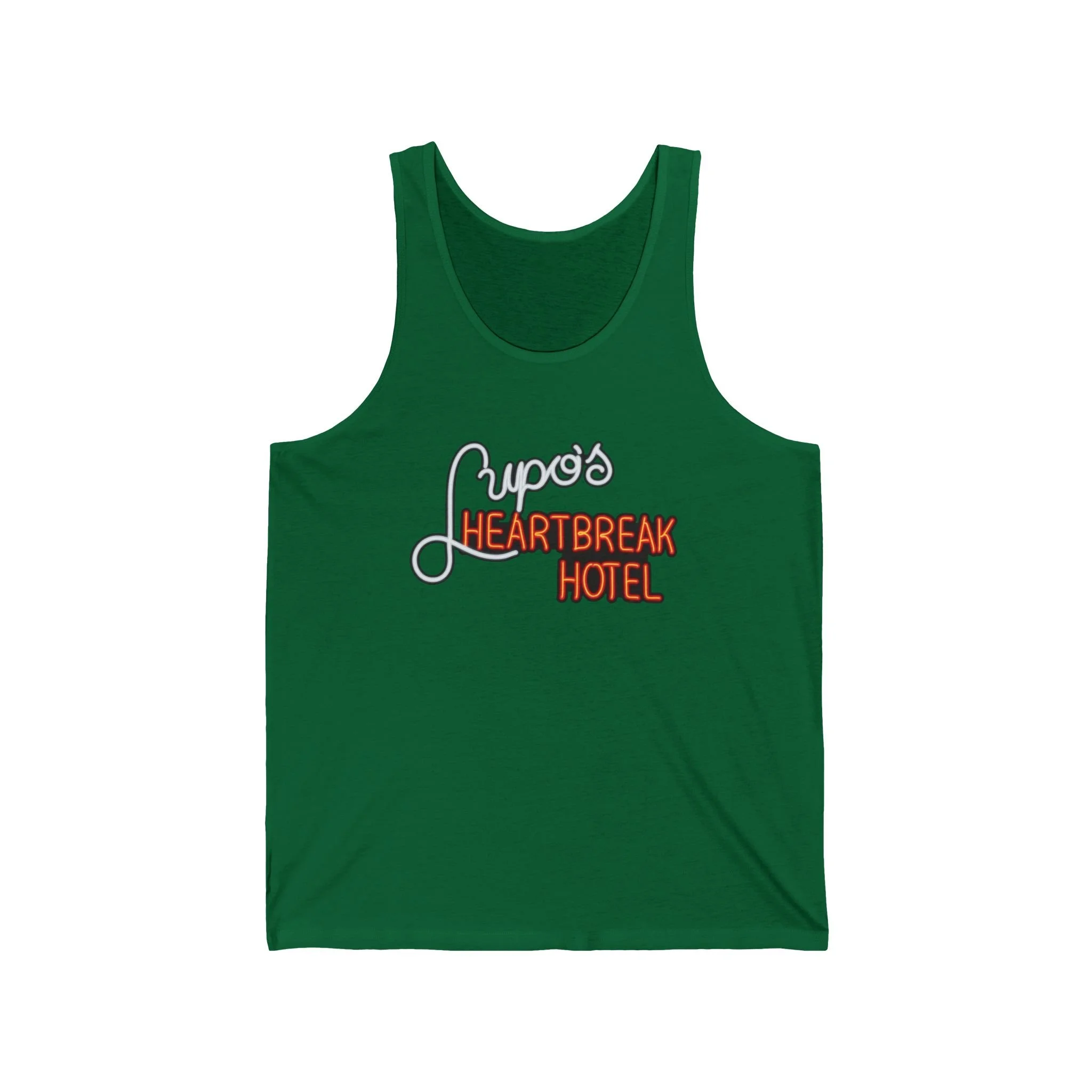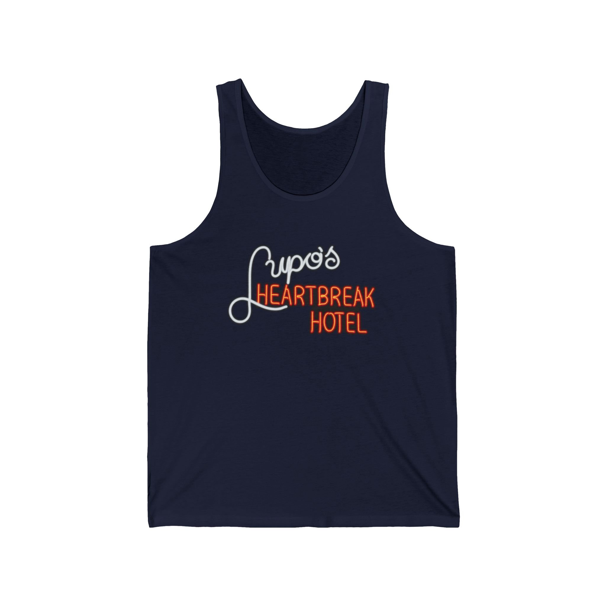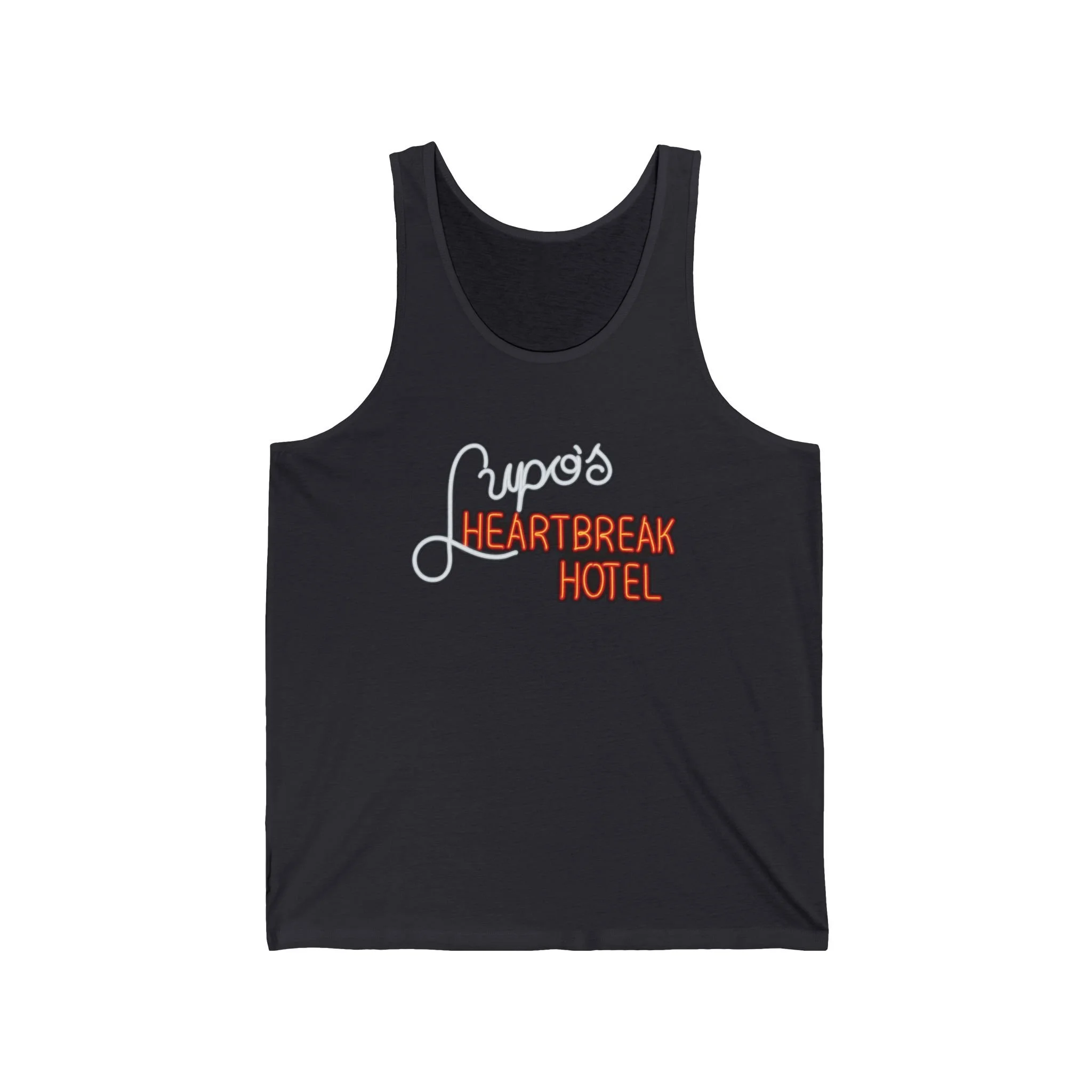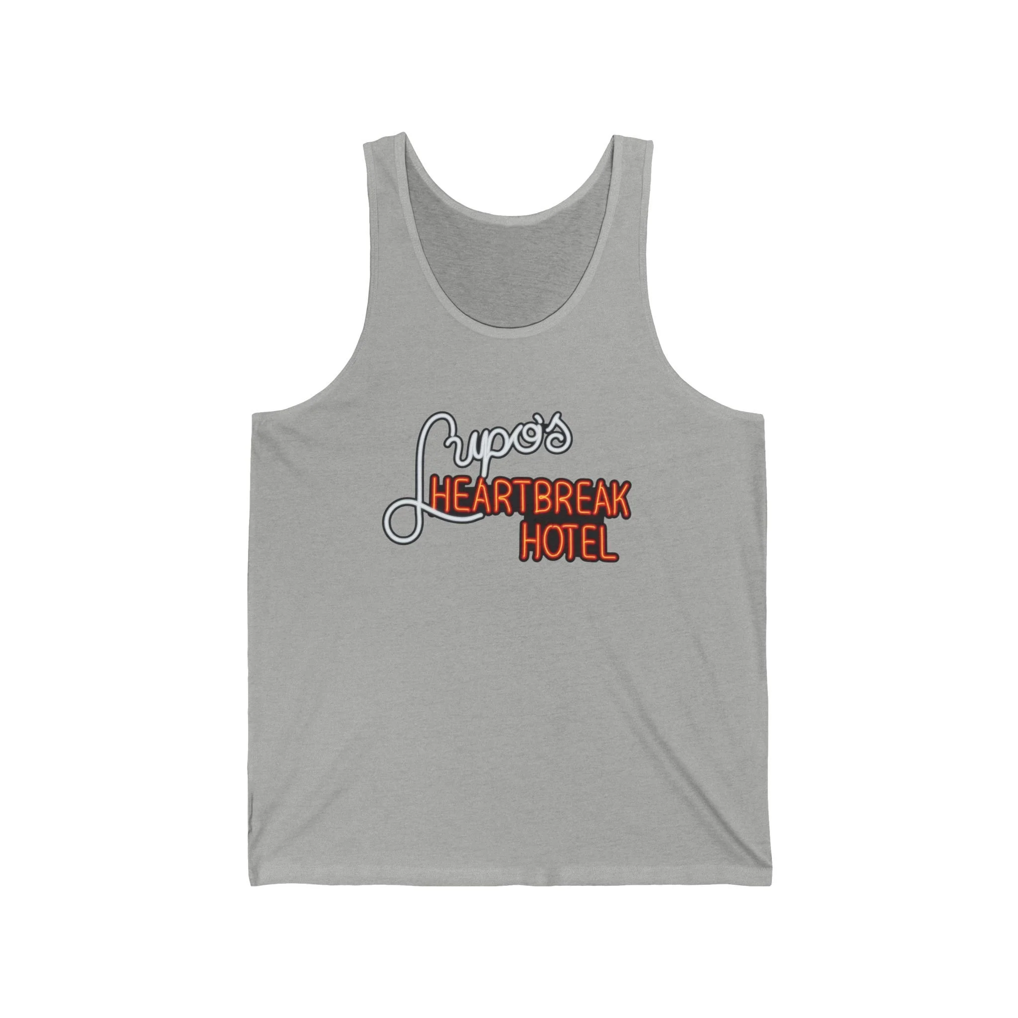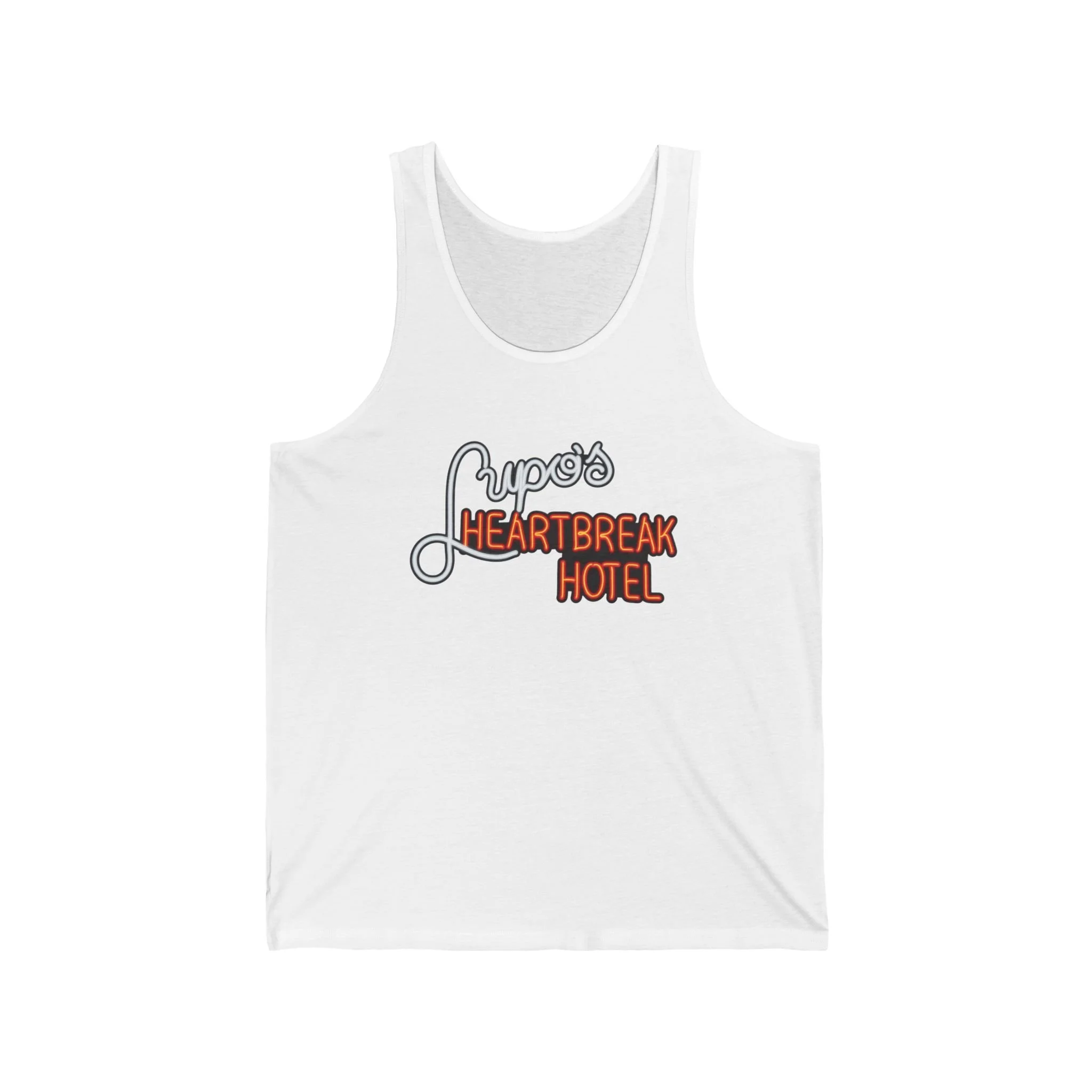 Cue the lights and crank the volume, Rhode Island rockers! Lupo's Heartbreak Hotel (better known as Lupo's or simply Lupo's) has been the beating heart of Providence's live music scene since 1975 — first in the heart of downtown, then at its iconic Washington Street location from the '80s through the early 2000s, and now thriving as Lupo's at The Strand. This legendary venue hosted everyone from U2's early U.S. shows to Bob Dylan, The Police, Talking Heads, Phish, Dave Matthews Band, and countless local heroes — all under that glowing neon sign promising heartbreak, high energy, and unforgettable nights. The sticky floors, packed balcony, and that unmistakable "Heartbreak Hotel" marquee became synonymous with Providence's gritty, passionate music culture — a place where you could lose your voice singing along and find your people in the crowd. This sleek tank revives the classic neon glow: "Lupo's" in elegant white script curving above the bold orange "HEARTBREAK HOTEL" blaze, all popping against black like the marquee lighting up on a Saturday night. Lightweight and breathable for summer festivals, bar hops, or just repping one of the Northeast's most enduring rock rooms when the temps rise. Soft fabric that feels like a fresh setlist in your hand — because some venues don't just host shows; they keep the heartbreak (and the hits) alive in retro style forever. Wear it out and spark those "I saw [band] at Lupo's back in the day!" stories from anyone who's ever rocked the Providence scene. Because in RI, some hotels don't check you in — they just break your heart with the best music around.