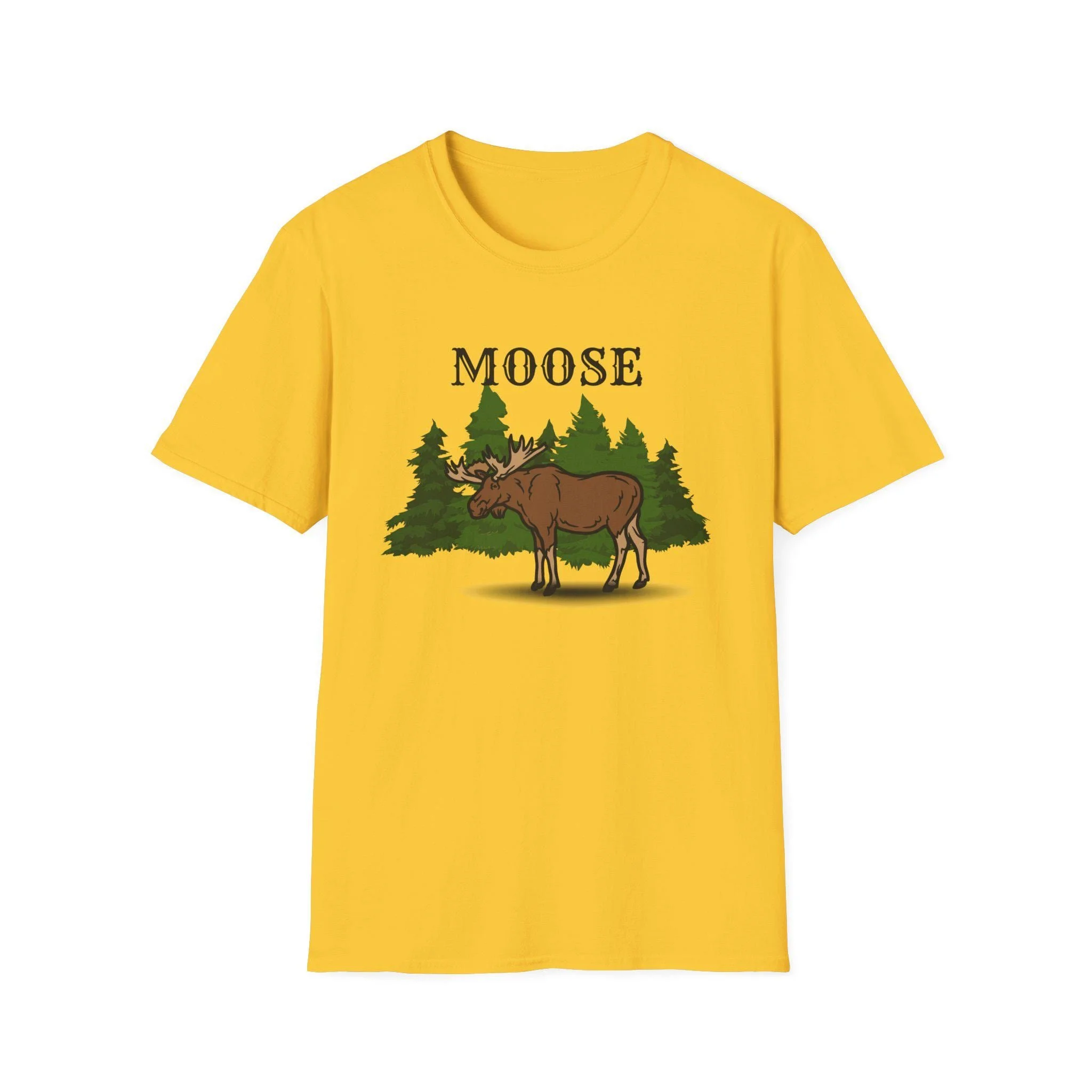 This soft, lightweight tee brings a quiet cabin-side moment into everyday wear. A hand-drawn moose stands against a band of evergreen silhouettes — earthy, a little wry, and quietly proud. The fabric drapes softly across the shoulders and breathes easily on long trail walks, weekend market stops, or evenings around a low-fire lantern. Wear it with worn denim, a flannel thrown over the shoulders, or layered under a field jacket. The muted illustration and warm shirt color feel at home on forest paths, lakeside docks, and relaxed town outings where the mood is calm and a little outdoorsy.