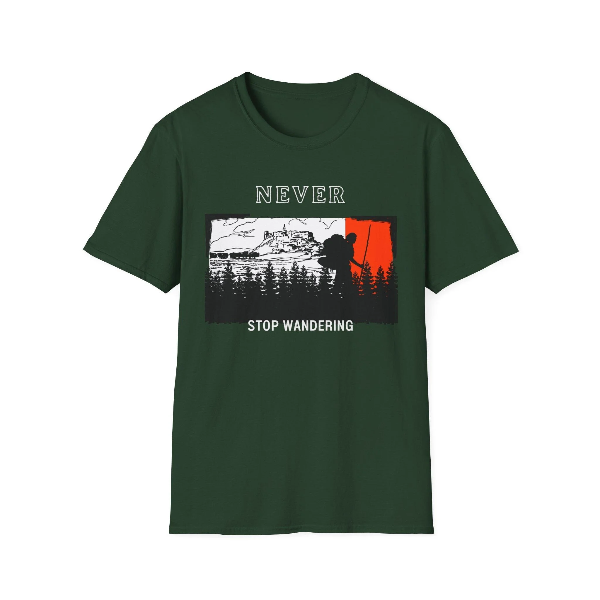 Never Stop Wandering T-Shirt | Hiking Mountain Silhouette, Forest Adventure