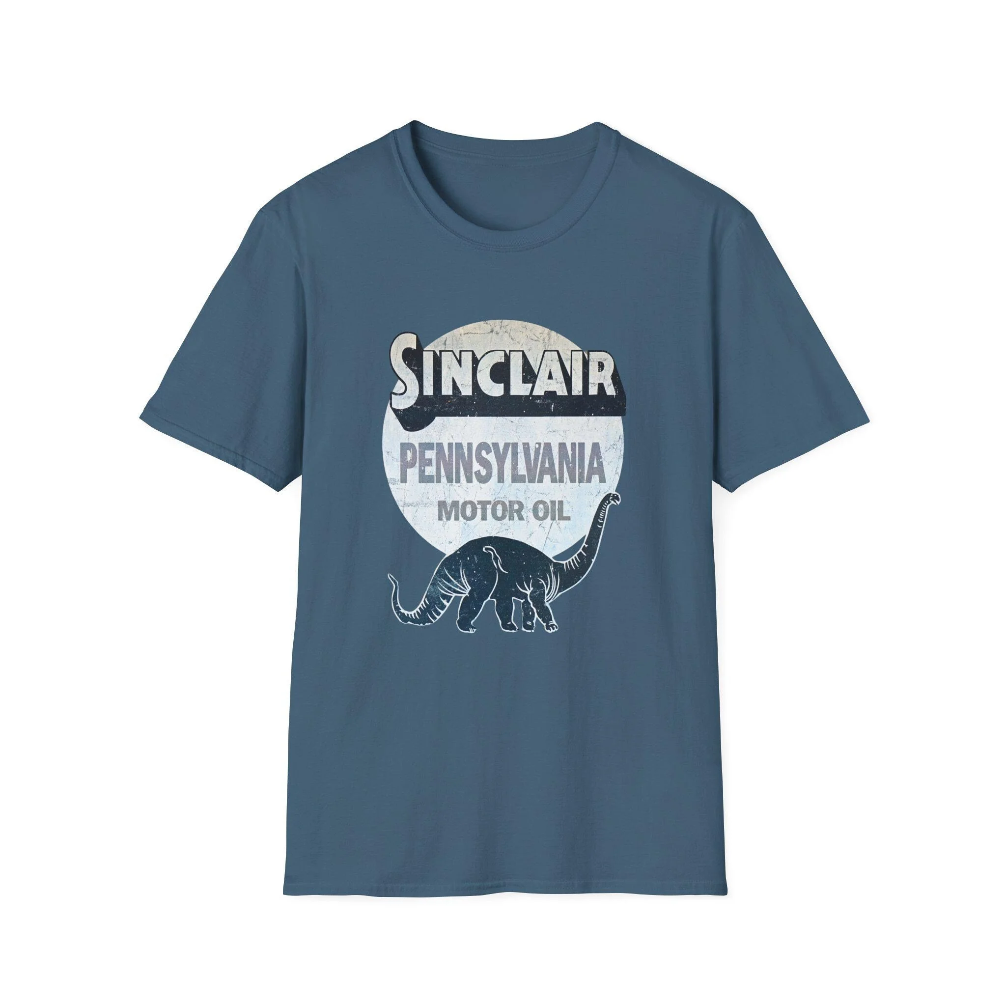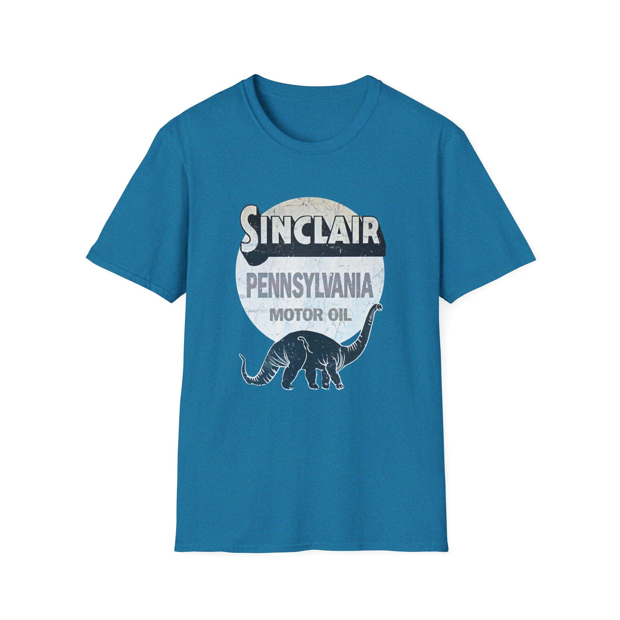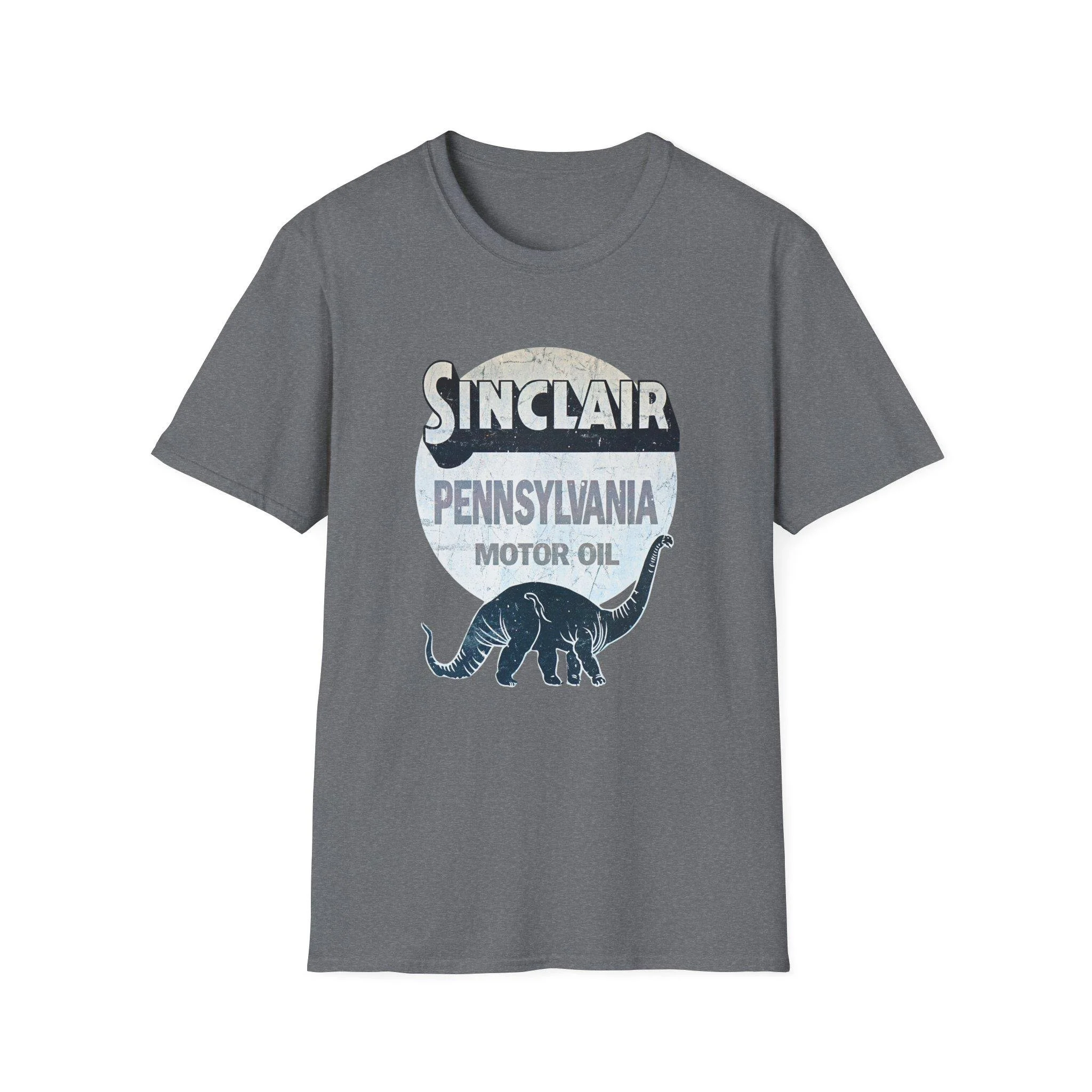 Lightweight and lived-in, this crewneck tee wears nostalgia like a badge. The vintage Sinclair Pennsylvanian motor oil shield and dinosaur silhouette sit softly on a heathered canvas, giving the shirt the feel of a favorite find at a roadside swap meet. It layers under a flannel for chilly mornings, pairs with worn jeans for Sunday drives, and reads like a little story about roads, engines, and long afternoons in the garage. Breathable, smooth ring-spun cotton keeps the print crisp while the garment stays comfortable all day.